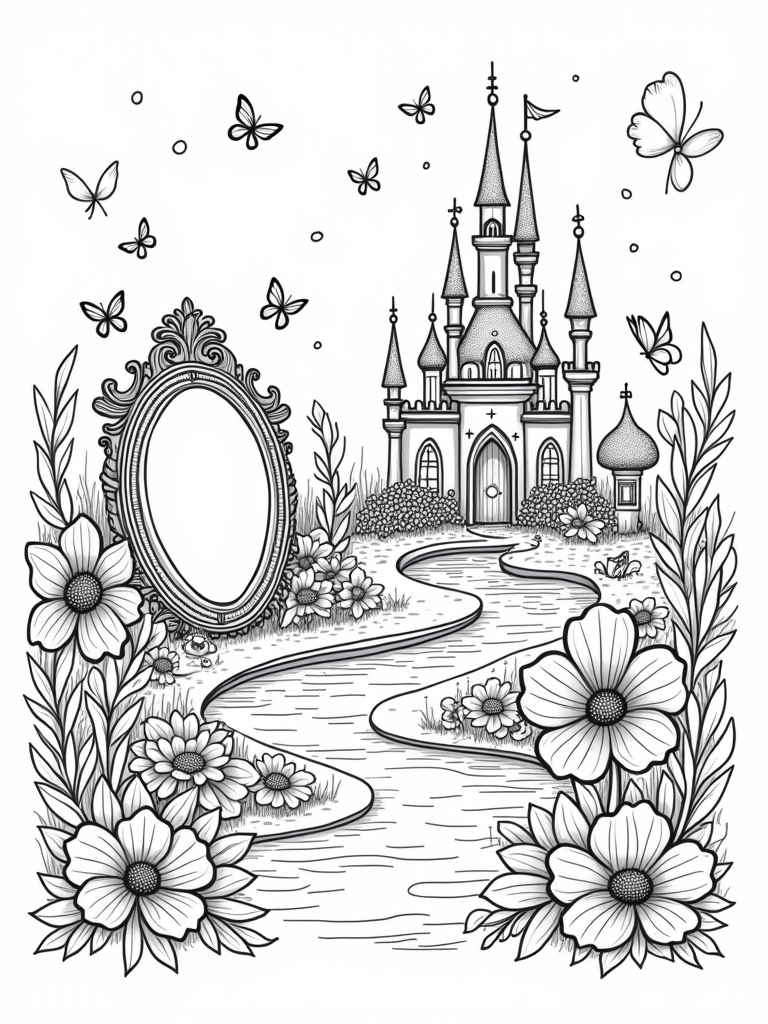 At the edge of the garden, there’s a large, ornate mirror framed by twisting vines and glowing fireflies. It invites you to explore and imagine what secrets it might hold. What do you think would happen if you looked into it?