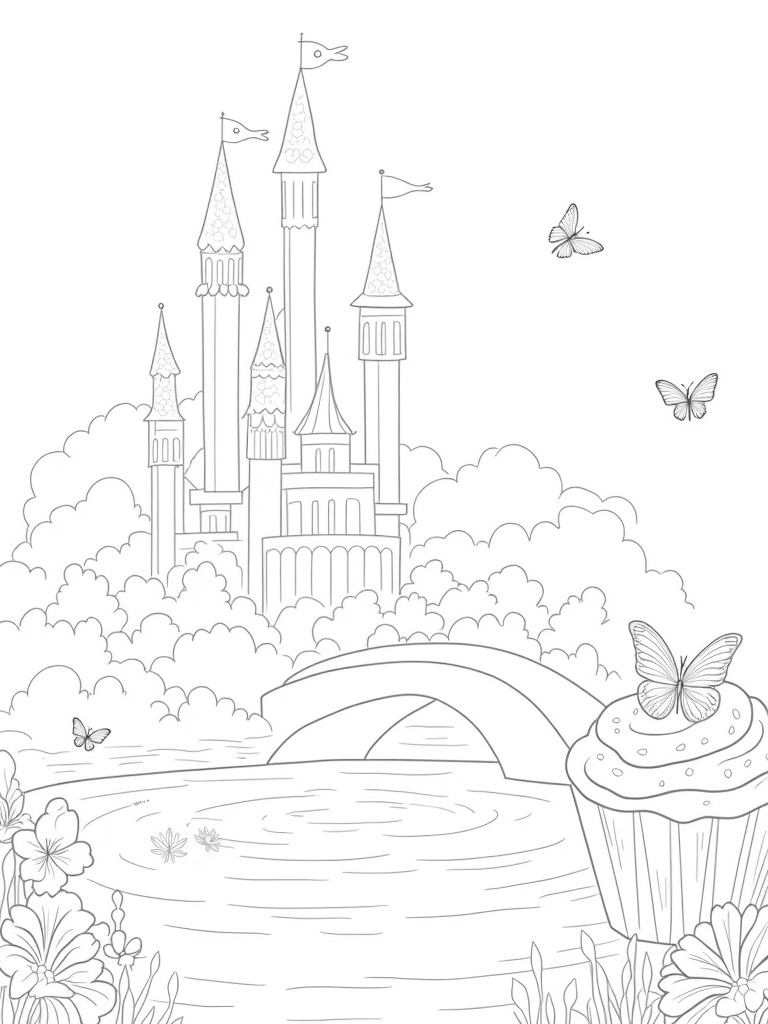 This coloring page shows a magical castle made of candy towers and fluffy marshmallow turrets. It floats above a dreamy landscape of cotton candy clouds. Below, a sparkling lake of blueberry syrup reflects the colorful castle, while licorice vines hang playfully over the edges. A giant cupcake acts as a bridge, leading to a whimsical garden filled with oversized flowers and butterflies with vibrant, kaleidoscope wings.