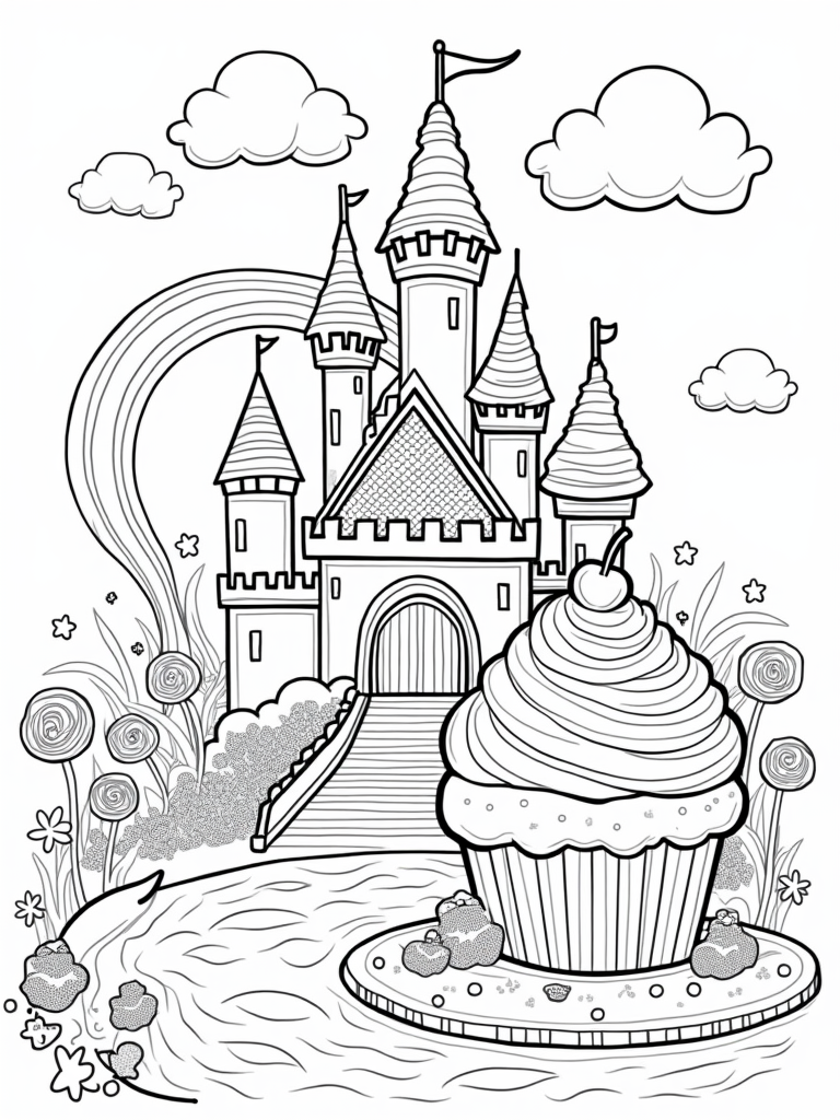 Candy Castle with Cupcake Throne and Gumdrop Garden Coloring Page