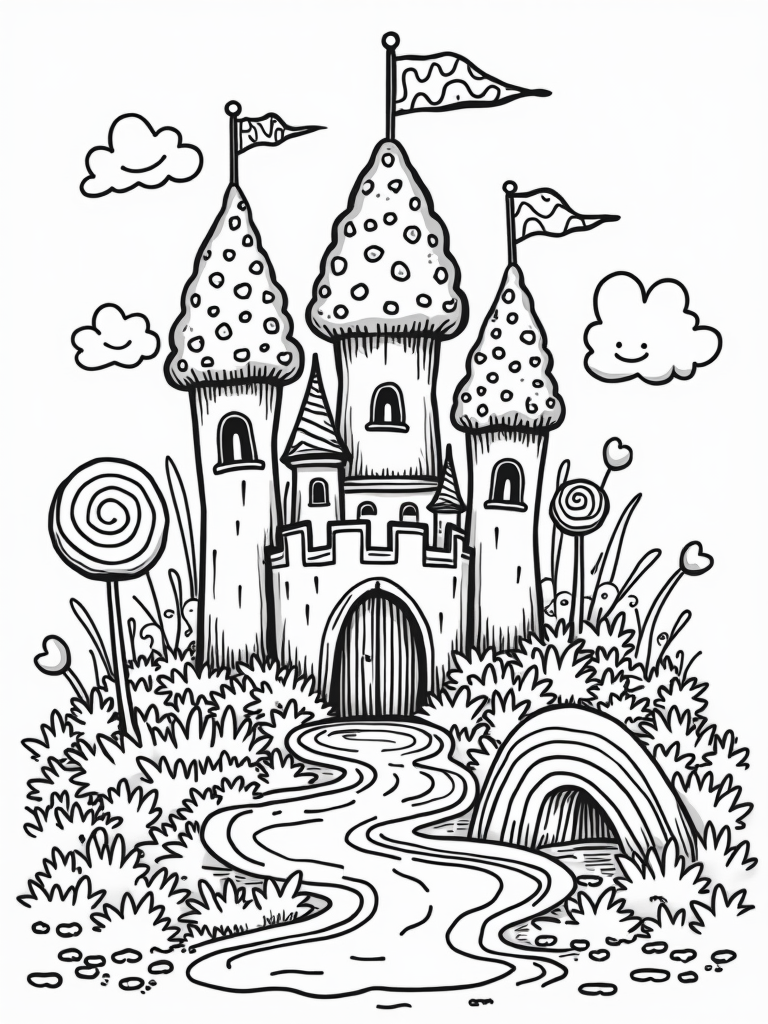 Check out this super sweet scene of a candy castle! The castle is made of cookie walls and has tall, colorful candy towers. Right in the center, there's a giant cupcake turret topped with sprinkles that look like they could jump right off the page!