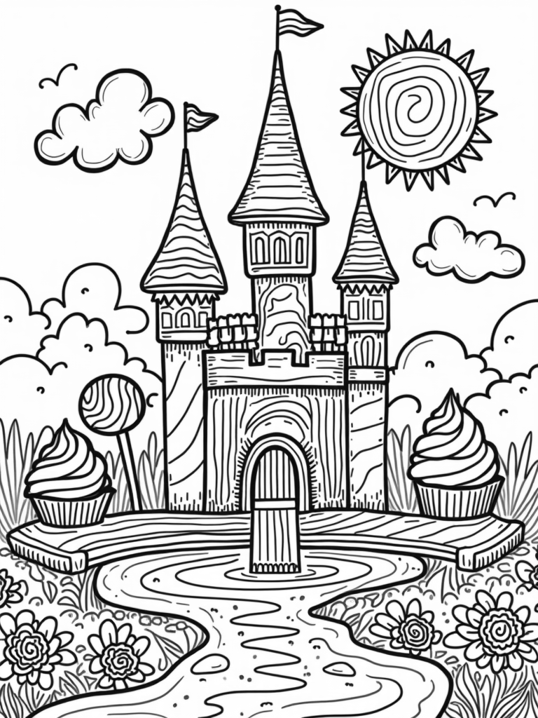 Check out this free, printable coloring page featuring a candy castle, gumdrop fountain, and oversized cupcakes. Perfect for kids who love all things sweet, it's sure to spark creativity and fun!