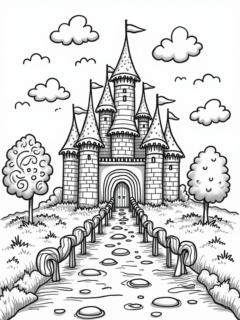 At the entrance, giant lollipops stand tall like friendly guards, ready to welcome you into this magical place. Fluffy clouds shaped like adorable animals float above, making the sky feel even more whimsical. Plus, there's a pathway made of marshmallow stones leading to a drawbridge with candy cane railings. It’s the kind of place that makes you want to grab your favorite crayons and start coloring right away!