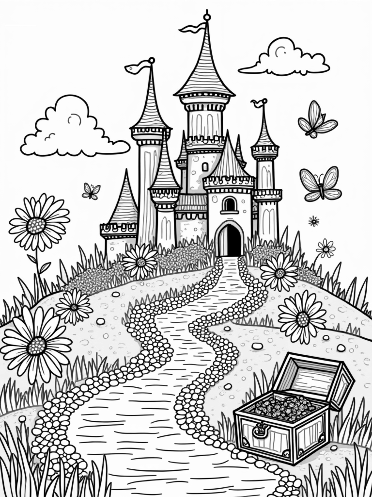 Surrounding the castle are giant butterflies flapping their translucent wings, dancing around oversized daisies. The scene is truly alive with color, especially with the sparkling river flowing by, reflecting the beauty of everything around it. It’s a perfect spot for some imaginative coloring!