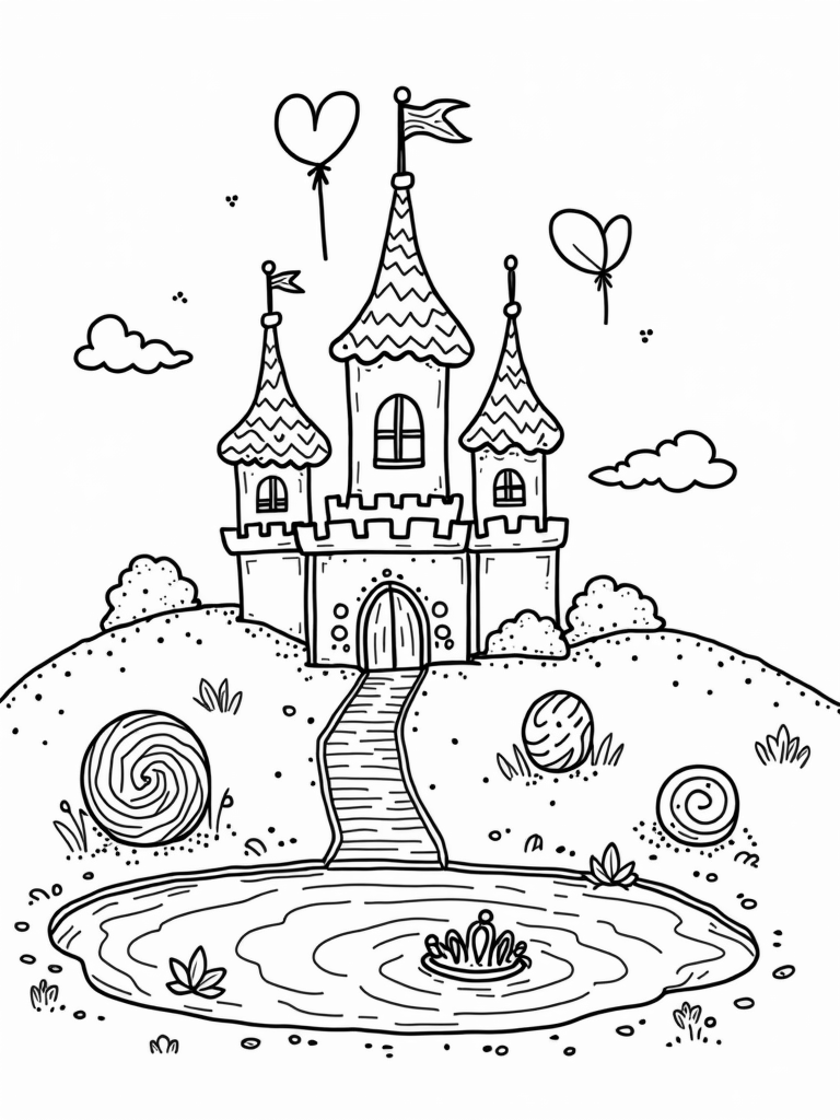Grab this free, printable coloring page featuring a candy castle, complete with a lollipop garden and a shimmering pond. Perfect for any princess-loving kid, this coloring page will spark creativity and sweet dreams!