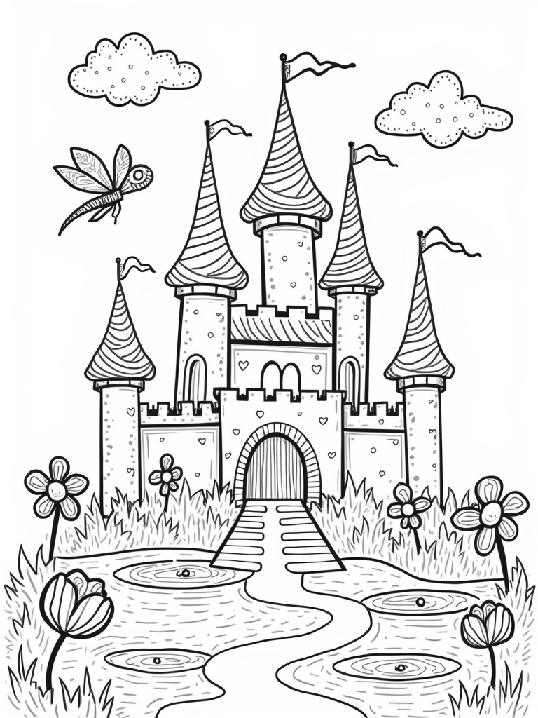 In front of the castle, there's a shimmering pond with lily pads shaped like crowns! A vibrant path lined with oversized flowers in all sorts of bright colors guides you right to the castle. Plus, a friendly dragonfly with big, shiny wings flits around, decorated with patterns that look like sparkling gemstones. It's a sweet scene that's just waiting for your creative touch!