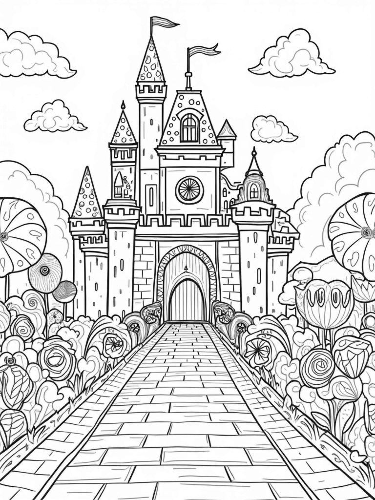 To one side of the castle, there's a charming path made of chocolate bricks that leads to a whimsical garden. Here, you'll find topiary shaped like crowns and tiaras, perfect for a little prince or princess. Oversized flowers with intricate petals surround the fountain, adding an extra splash of color and fun. Fluffy clouds shaped like hearts float lazily above, completing this delightful candy kingdom.