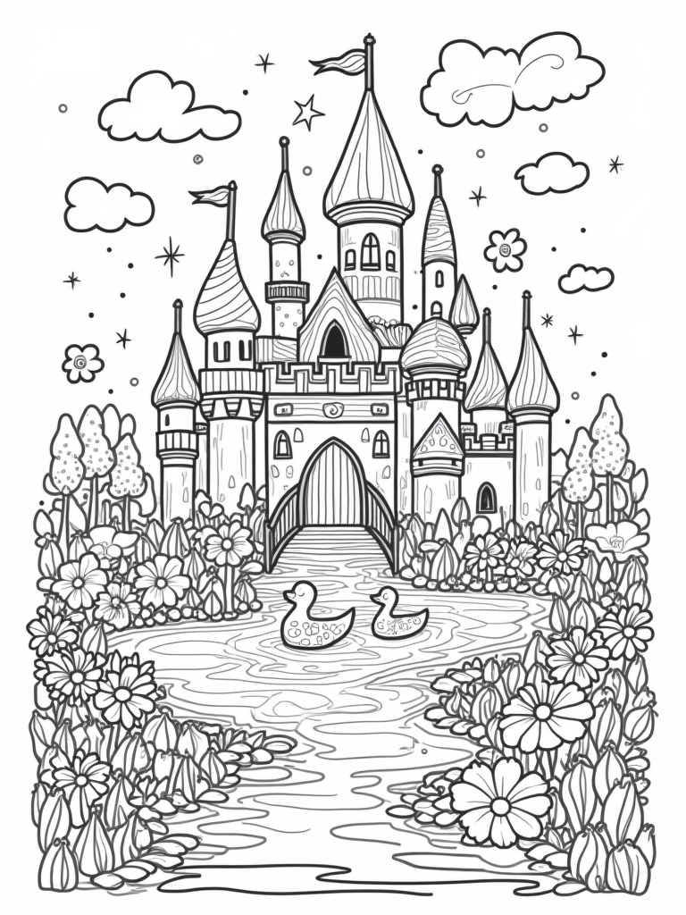 This coloring page brings to life a candy castle that looks like something straight out of a sweet dream! The castle is topped with giant lollipop turrets and gumdrops that sparkle in the sunlight. Surrounding it is a shimmering river of chocolate syrup where adorable marshmallow ducks drift by, making it a cozy spot for a relaxing day.