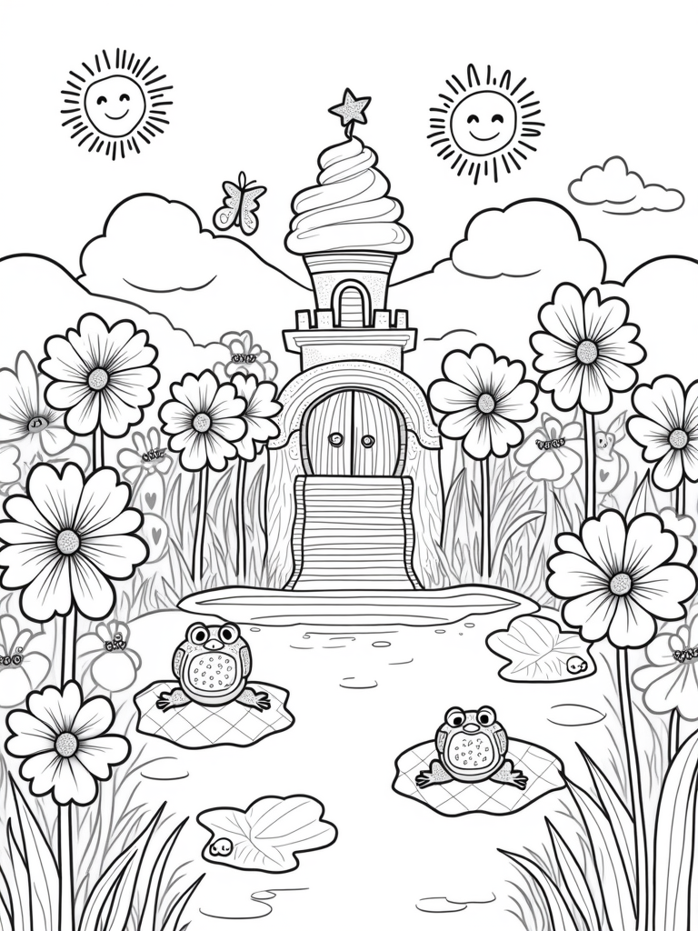 This delightful scene is all about fun and imagination! You’ll spot giant flowers shaped like hearts, bursting with candy colors. In the center stands a magnificent ice cream castle topped with a cherry, surrounded by a magical rainbow pathway that invites you to explore. Don’t forget to glance at the oversized butterflies fluttering above a sparkling pond where friendly frogs hop around on lily pads that look like crowns!