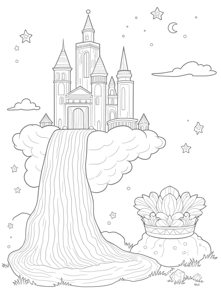 Check out this free, printable coloring page featuring a magical castle in the clouds! Perfect for any princess-themed coloring fun. Let your creativity shine as you color the ribbons, tiara, and sparkling pond.