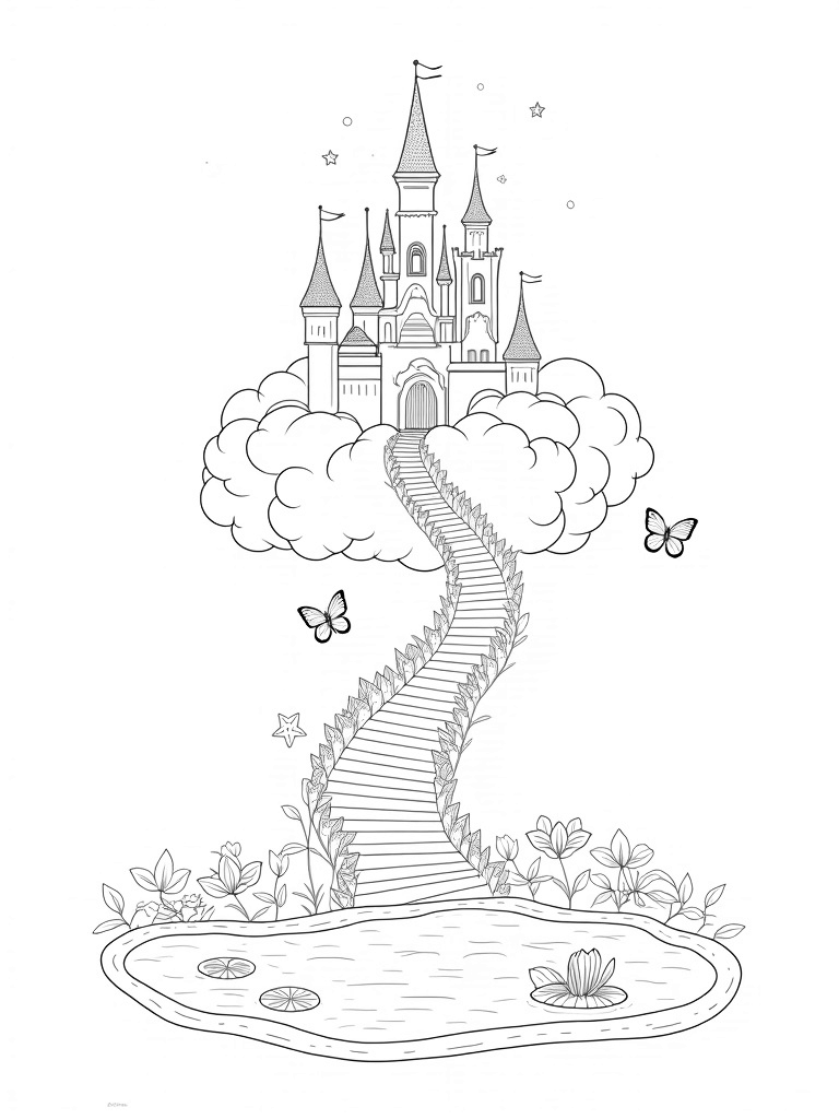 Oversized flowers bloom from the cloud, their heart-shaped petals adding a sweet touch. Butterflies flit around, each with unique wing patterns that are just waiting for your colorful touch. In the foreground, a crystal-clear pond reflects the castle beautifully, with lily pads that look like little crowns floating on the surface. Each detail is ready for you to bring it to life with color!