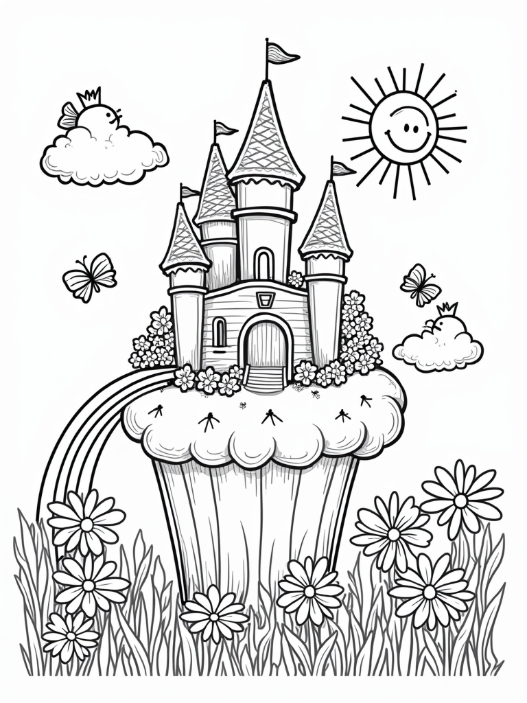 This page is perfect for kids who love to color! With clean outlines and cute details, it offers a fun way to bring this whimsical scene to life. Grab your favorite crayons or markers and let your imagination run wild! You can choose any colors you like for the castle, the cupcake, and even the flowers. There are no rules hereājust pure creativity!