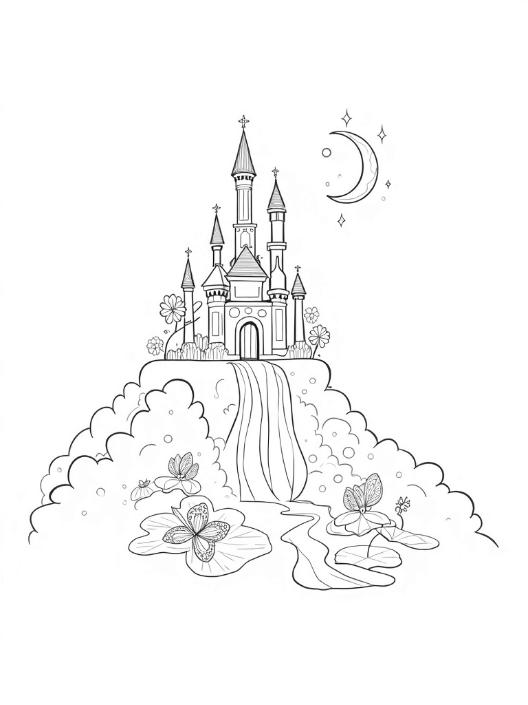 Check out this free, printable coloring page featuring a magical castle on a cloud, complete with flower turrets and sparkling waterfalls. Perfect for kids who love princesses and whimsical scenes, this coloring page is sure to spark their imaginations!