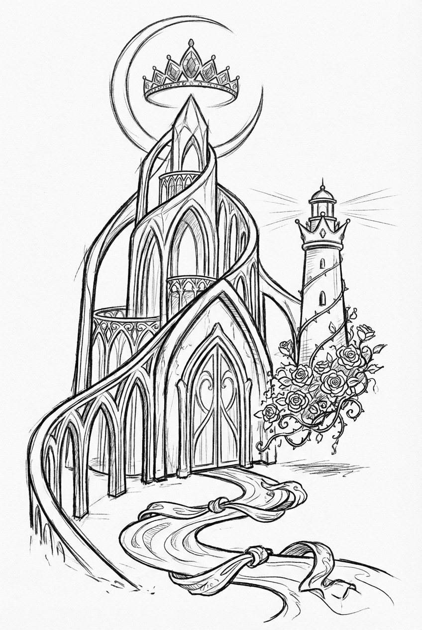 Look at that soaring crystal castle, its arches and open balconies stretching up like a glittering stairway. At the very top, a jeweled tiara hovers like a moon, catching the light. Below, a river made of silky ribbons winds through the courtyard, perfect for bright blues and pinks. Beside the main gate, a floating rose garden hovers in mid‑air, and a crown‑shaped lighthouse stands proudly, its lantern ready to glow with any hue you choose.