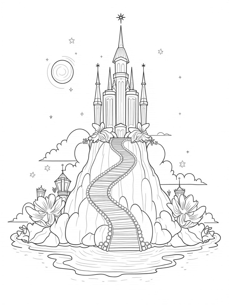 As you color this enchanting scene, don't forget about the winding staircase made of glimmering gemstones that leads to the castle's entrance. It's flanked by whimsical lanterns shaped like crowns, adding a touch of royal flair. The gentle wind makes everything sway softly, creating a serene and dreamy atmosphere perfect for your artistic touch!
