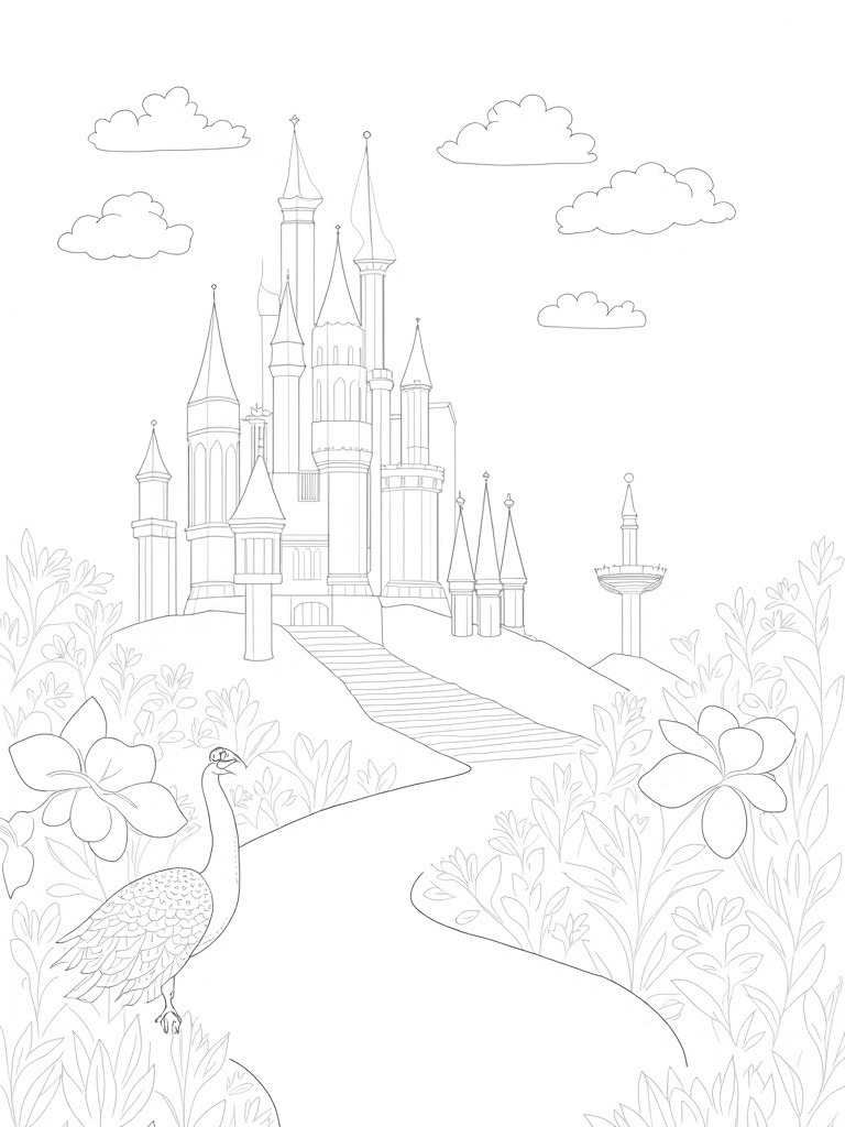 Crystal Castle on a Hill with a Majestic Peacock Coloring Page
