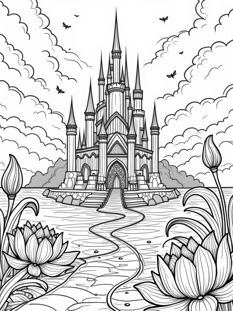 Check out this free printable coloring page featuring a crystal castle on a lily pad, perfect for kids who love princesses and magical scenes. Grab your crayons and start coloring this enchanting scene today!