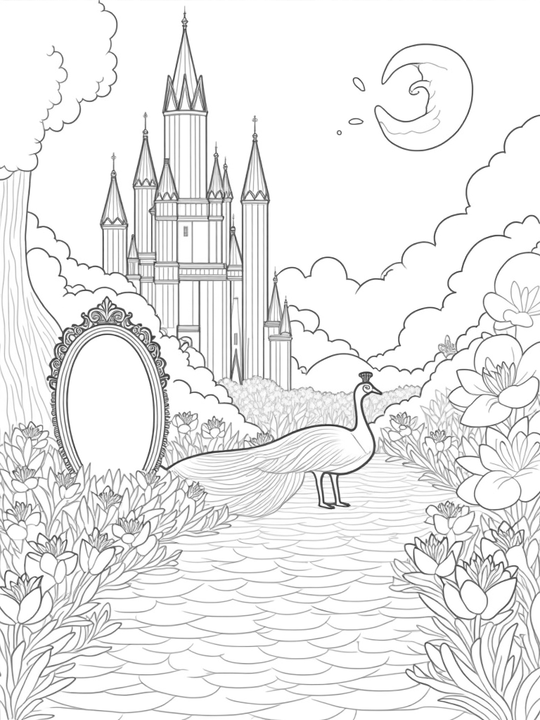 Just nearby, a majestic peacock spreads its colorful feathers, showing off shades of blue and green that shimmer in the light. It stands proudly next to a large, ornate mirror leaning against a tree trunk, adding a touch of magic to the whole picture. Can you imagine what it would feel like to walk through this enchanting garden?