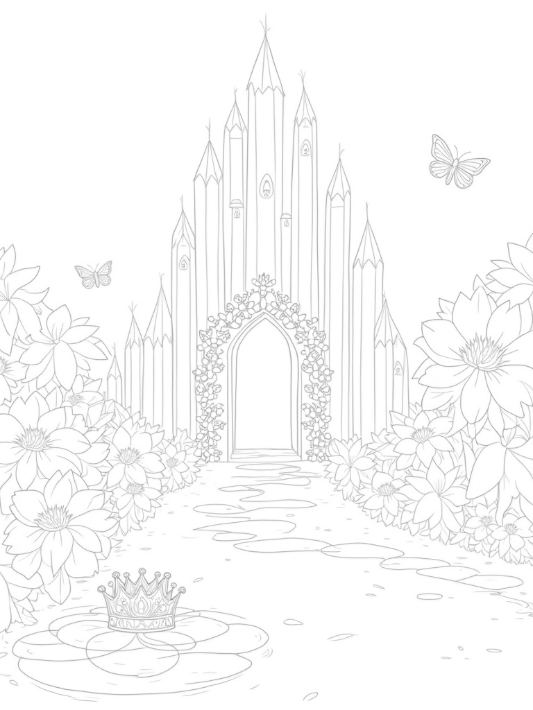 Walking towards the castle, there’s a winding cobblestone path leading to a grand archway draped in golden vines. Butterflies are fluttering about, adding to the enchanting scene. Plus, a tranquil pond reflects the castle’s beauty, with lily pads and an ornate crown that glimmers in the sunlight. What colors will you choose for the crown?