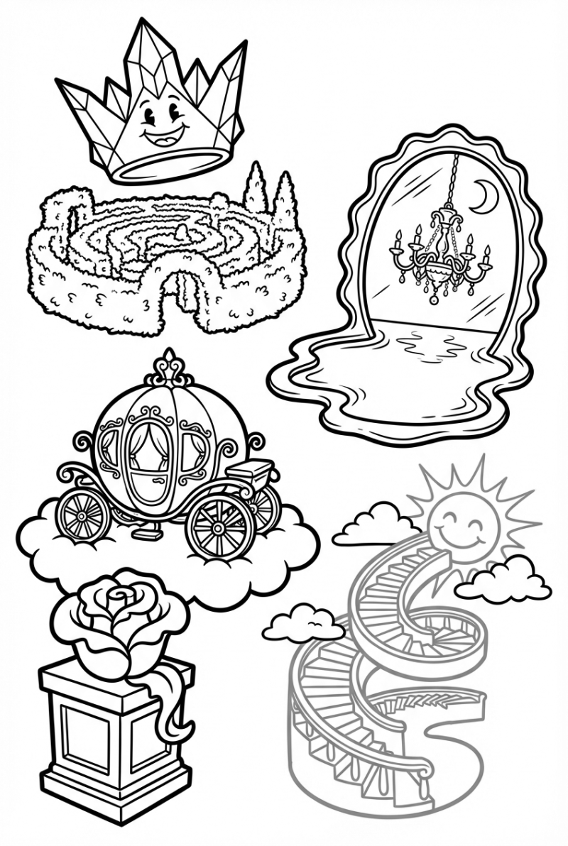 Take a look: a sparkling crystal crown floats above a twisty garden maze, while a silver carriage sits on a fluffy cloud platform next to a marble pedestal holding a rose that’s blooming with jewels. Over by a calm mirror lake, a moonlit chandelier hangs in mid‑air, and a golden staircase curls up toward a sunrise sky. The whole scene is drawn in bold, playful lines so kids can add their own colors however they like.