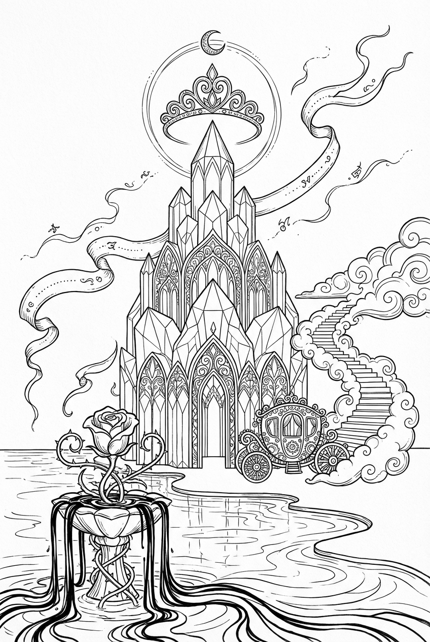 Look at that towering crystal palace popping up from a glassy lake. Its spire wears a floating silver tiara that circles like a tiny moon. Down below, a rose‑shaped fountain drips ink into the water, and the palace doorway opens onto a golden carriage that unfurls into a spiraling staircase climbing into soft clouds. Little ribbons flutter everywhere, drawing invisible paths up into the sky.