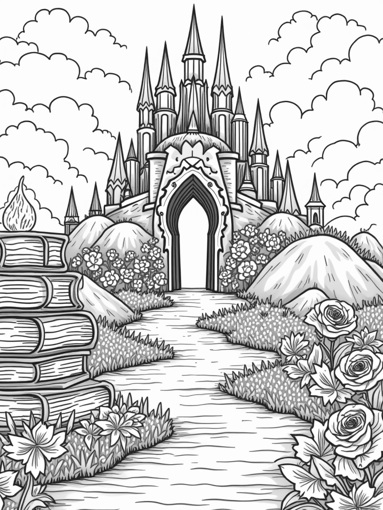 Next to the books, a whimsical fountain flows with sparkling stardust, adding a sprinkle of magic to the scene. And don’t miss the oversized roses blooming nearby with intricate petal designs, just waiting to be filled with bright colors. This coloring page is all about creativity—kids can bring this enchanting world to life with their favorite hues!
