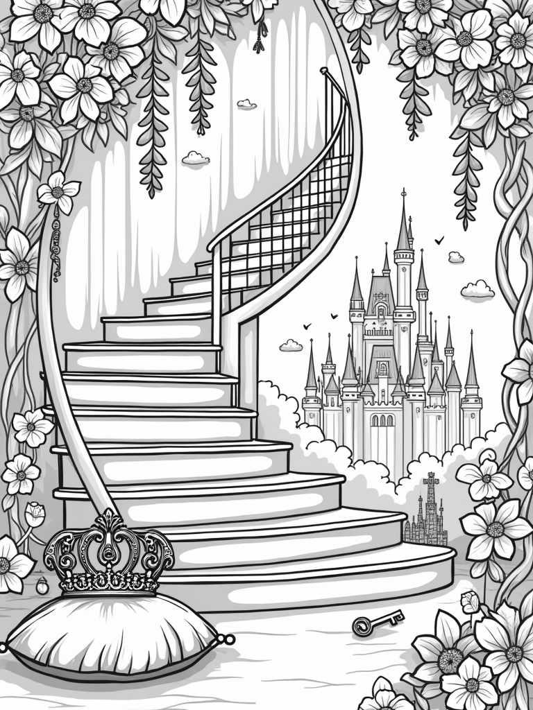 Check out this free, printable coloring page featuring a magical crystal staircase surrounded by oversized flowers. Perfect for kids who love princess themes and imaginative scenes!
