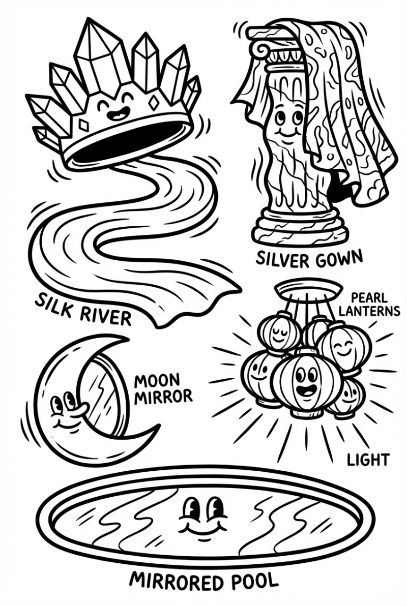 Try bright blues and purples for the ribbon river—something that feels like a shimmering stream. The crystal tiara loves sparkle, so think glittery whites or pastel pinks with a hint of silver. For the marble column and gown, soft grays and silvers work well, but you can also go bold with lavender or teal if you want a fairy‑tale vibe. The pearl lanterns look cute in pearly whites or pastel yellows, and the moon mirror is perfect for a gentle glow using light blues or lavender.