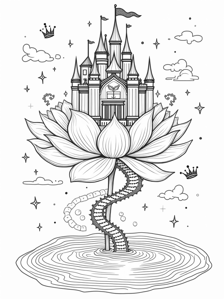 Just beside the castle, a staircase made of shimmering pearls spirals up to a lovely balcony adorned with intricate lace curtains that flutter in the breeze. Don’t forget to add your own splash of color to the wisps of sparkling magic swirling around, creating a dreamy, whimsical atmosphere!