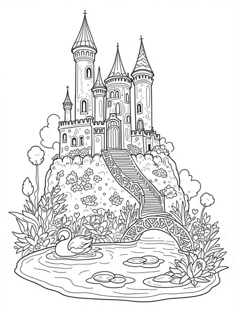 Enchanted Castle with Spiraled Towers and Serene Pond Coloring Page