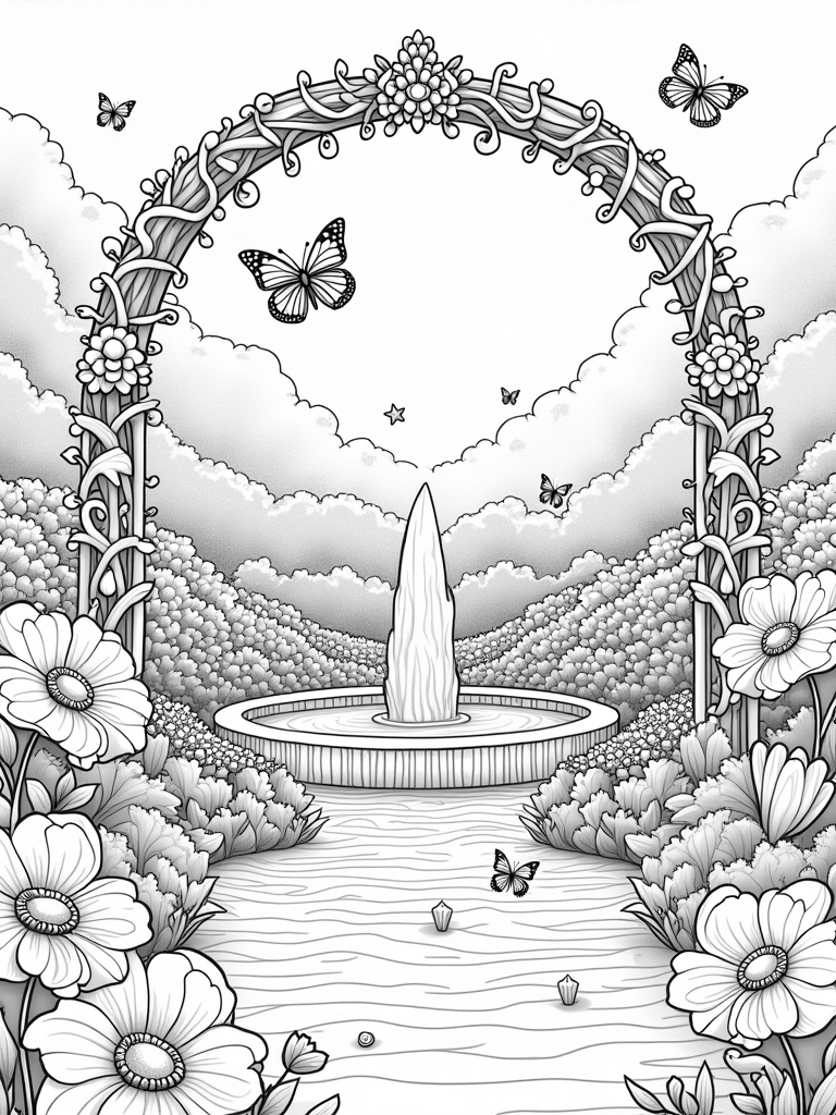 Don’t forget to look closely for the sparkling gemstones scattered among the flowers, catching the sunlight and casting playful reflections. And there's a whimsical archway made of intertwined vines and jewels, inviting you to step into this delightful garden. It’s a place where imagination runs wild, and every corner offers something new to color!