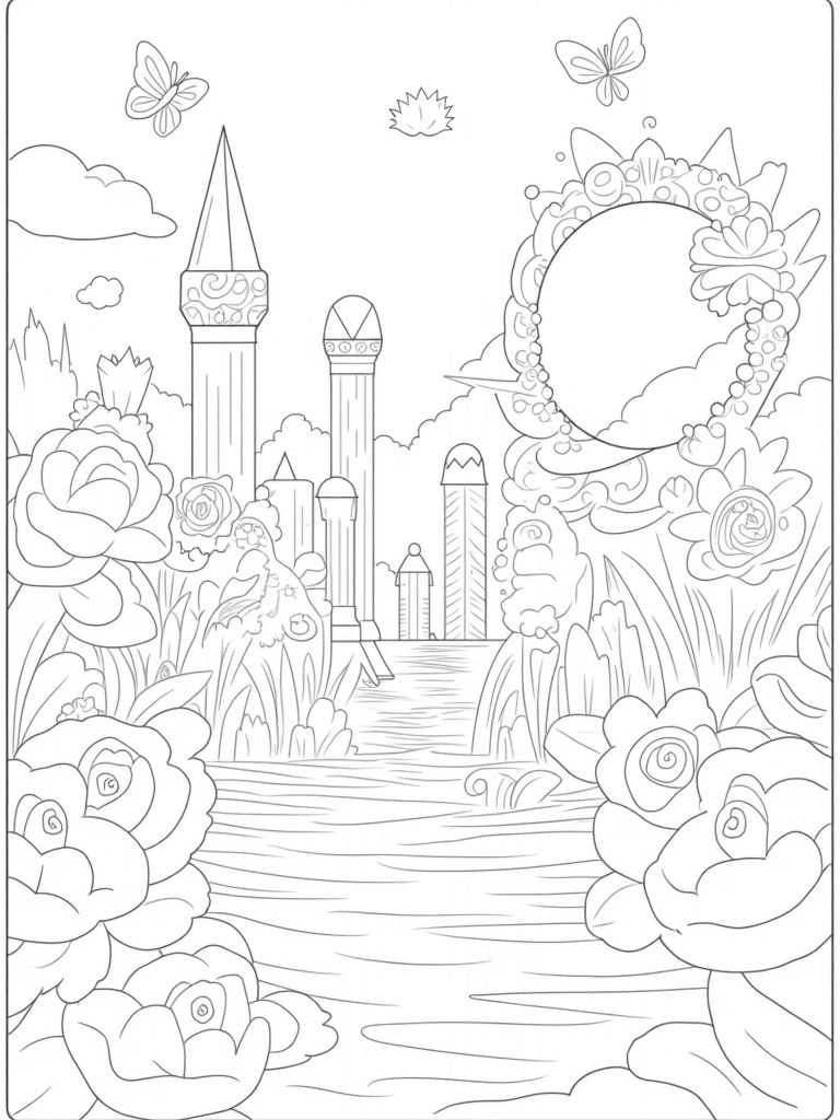 As you color, don’t forget to add some vibrant colors to the whimsical butterflies dancing around. They have intricate patterns that make them look even more special. And what about that large, ornate mirror? It reflects all the beautiful scenery, making the garden feel even more enchanting. Let your creativity flow as you bring this magical world to life!