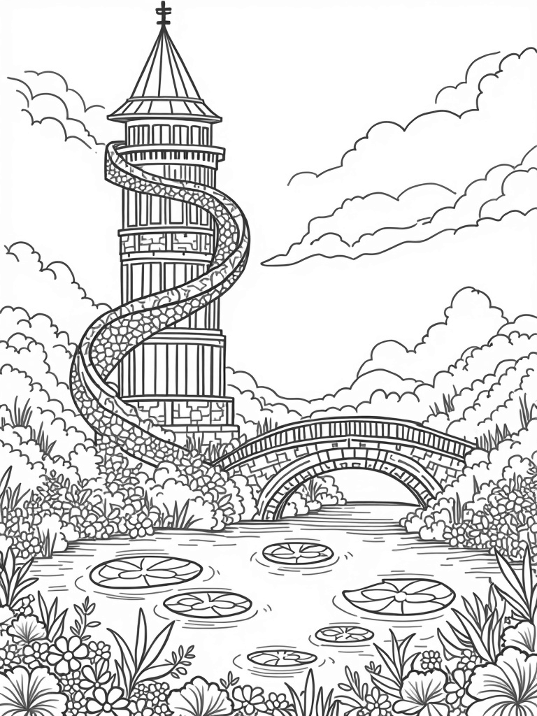 Imagine a grand castle tower that spirals high into the sky, decorated with beautiful windows and balconies draped in lovely vines. Underneath, a stunning bridge made of rainbow-colored gemstones arcs over a peaceful pond where oversized lily pads float, their surfaces sparkling like stained glass. Nearby, there's a fountain shaped like a blooming rose, gently cascading water that glimmers in the sunlight.