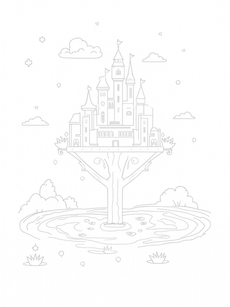 This enchanting scene features a grand floating castle made of soft pink clouds, with sparkling spires that look like they’re adorned with stars. Below, a calm lake perfectly mirrors the castle, while lily pads shaped like royal crowns dot the water's surface. A winding golden brick path leads to a giant, ornate mirror surrounded by lush vines, reflecting the beauty of a magical garden filled with oversized flowers and twinkling fireflies.