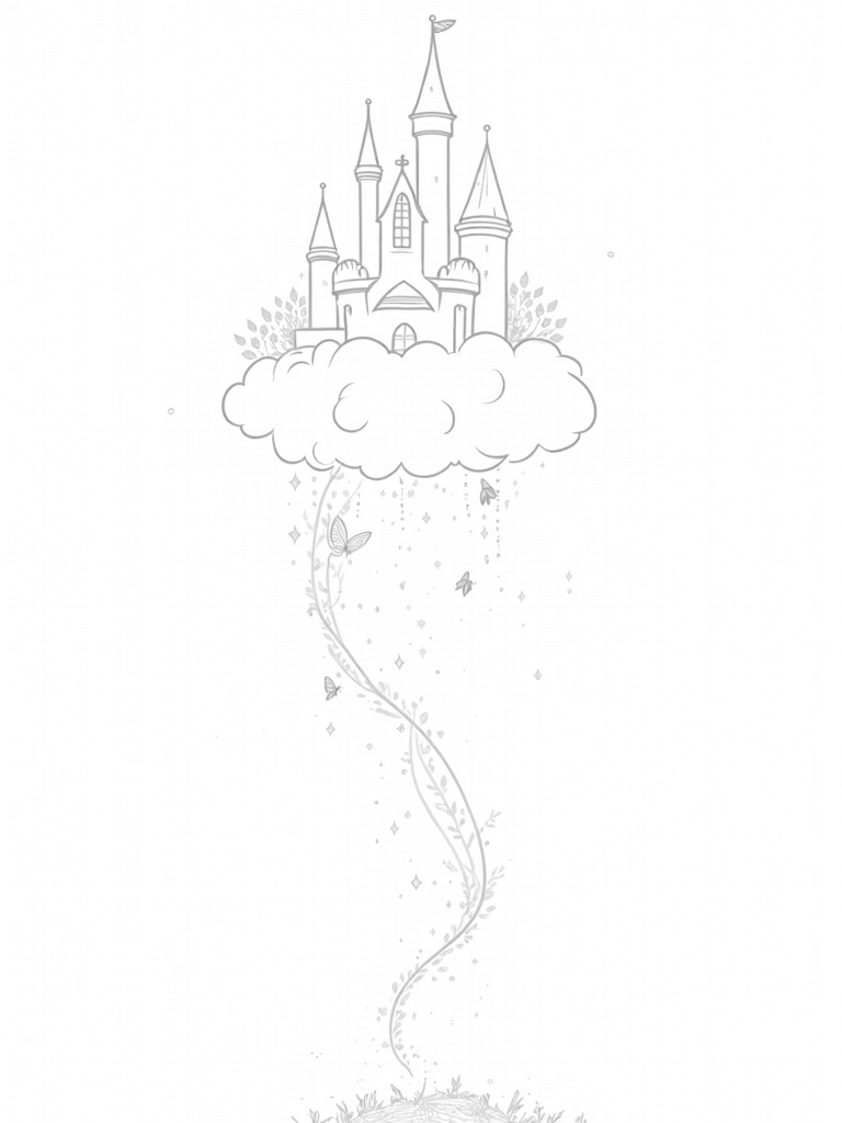 There’s also a grand mirror nearby, beautifully ornate and catching the castle's reflection. Delicate vines surround it, and butterflies flutter around, adding a touch of whimsy. And if you look closely, you’ll see a spiral staircase made of shimmering starlight spiraling down from the cloud, leading to a path of colorful gemstones scattered across the ground. Just think of all the colors you can use!