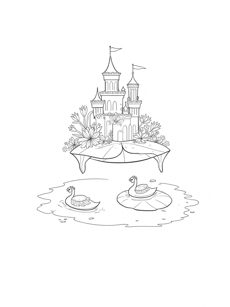 In the foreground, there's a crystal-clear pond that perfectly reflects the castle above. It's so serene! You can even spot a couple of swan-shaped boats gently bobbing on the water, tied up with shiny golden ropes. Imagine taking a peaceful ride in one of those boats while soaking in the beauty of this fairytale setting!