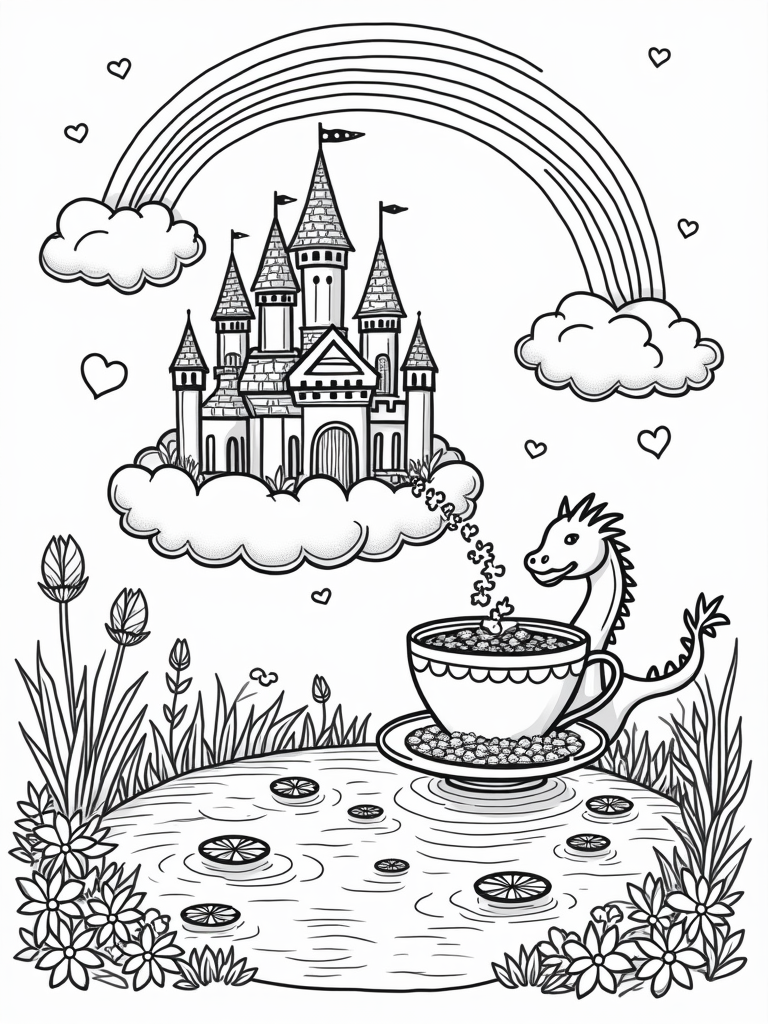 To the side, a giant teacup spills vibrant flower petals, creating a lovely pathway that invites you to explore. On the other side, a friendly dragon curls around a sparkling heart-shaped crystal, giving the whole scene a touch of whimsy. The outlines are perfect for kids to bring their colorful imagination to life!