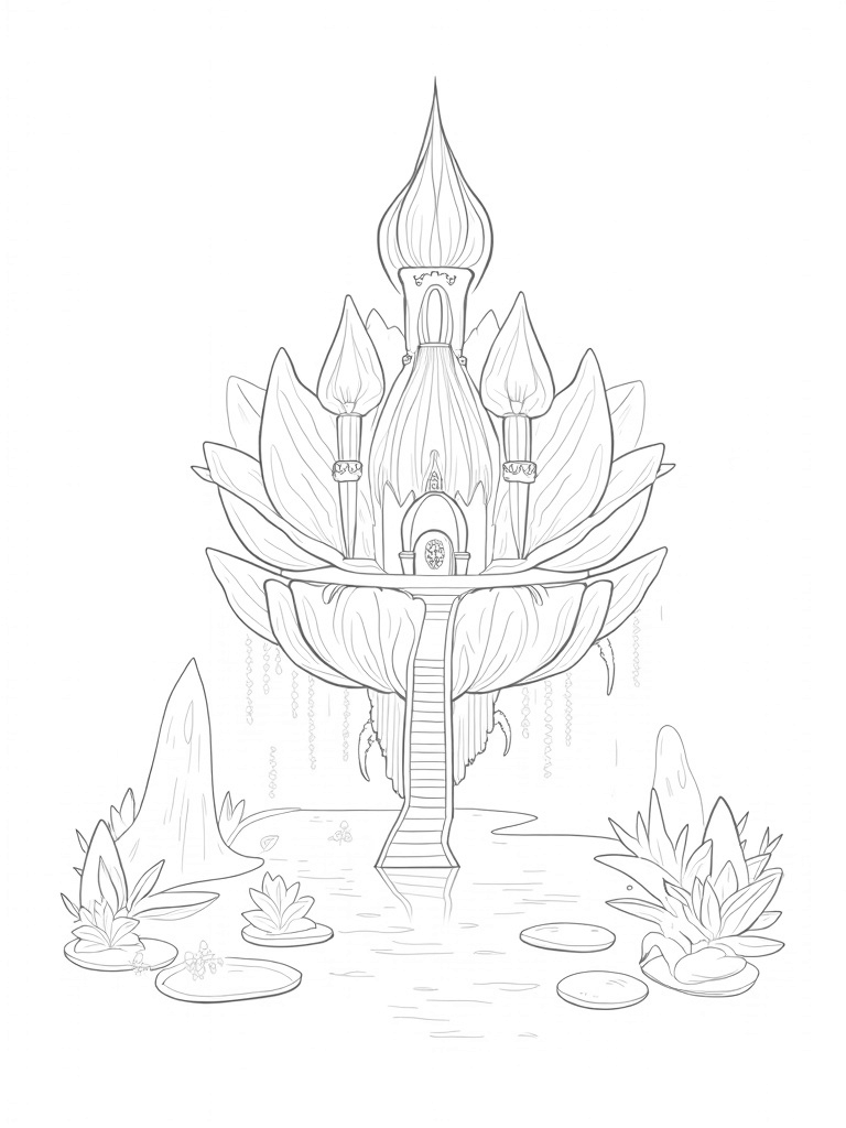 In this magical scene, a grand floating castle hovers gently above a sparkling lake. The castle is adorned with oversized flowers, each petal resembling a delicate crown. Underneath, the lake reflects the brilliant colors of the sky, creating a dreamlike atmosphere. If you look closely, you’ll spot giant lily pads serving as platforms for graceful swans gliding across the water.