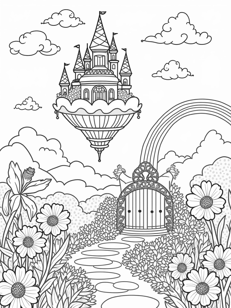 Imagine a dreamy castle that’s not just sitting on the ground but floating high up in the sky! Its towers twist and turn like giant ice cream cones, making it look like a place straight out of a fairy tale. Below the castle, a vibrant garden blooms with oversized flowers that have petals full of swirly patterns. Each flower is like a work of art waiting for your favorite colors!