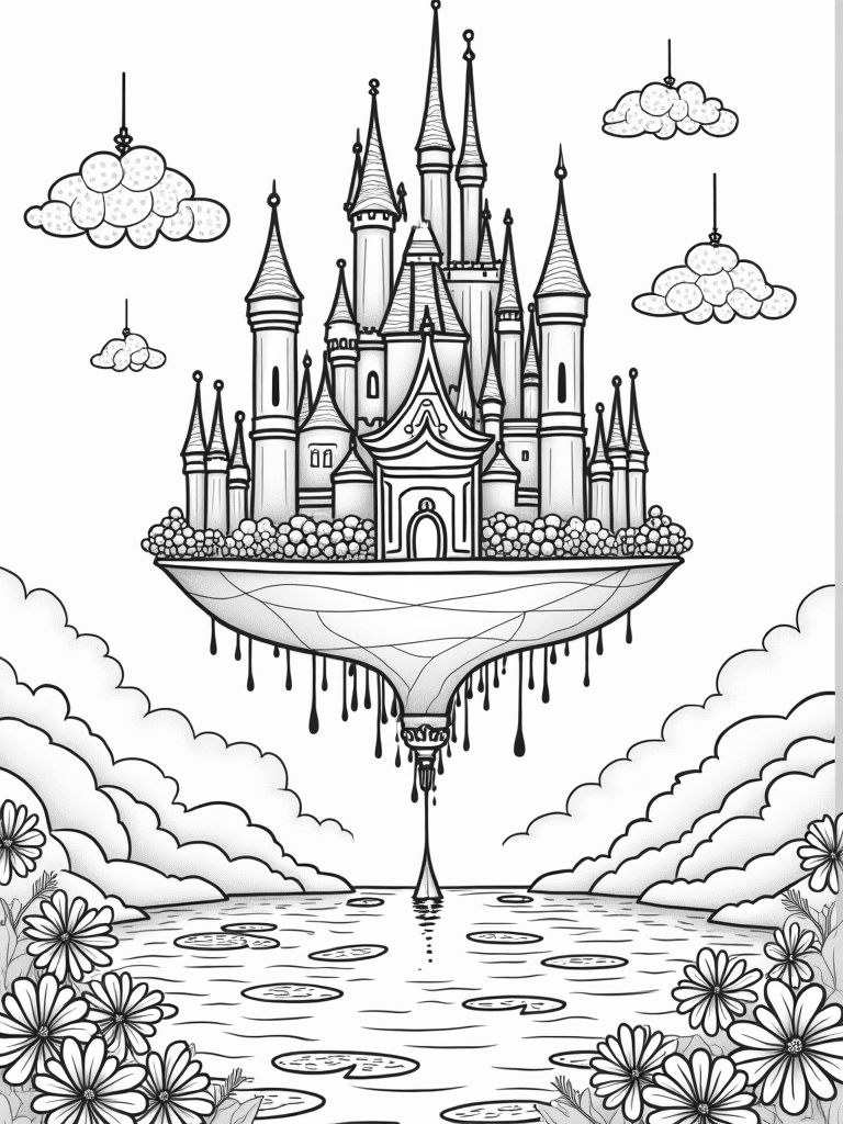 Floating Castle with Iridescent Towers and Shimmering Lake Coloring Page
