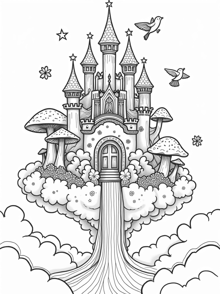 Floating Castle with Starry Waterfall and Giant Mushrooms Coloring Page