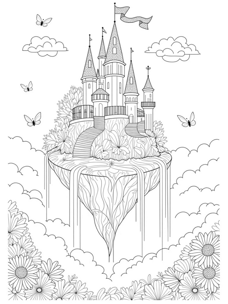 Floating Castle with Waterfalls and a Whimsical Garden Coloring Page