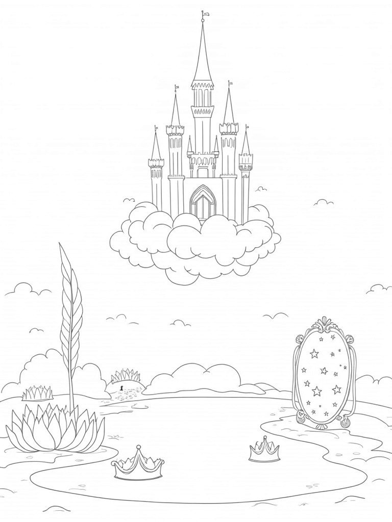You’ll find a stunning castle floating high above the clouds, with gorgeous crystal spires that sparkle like jewels. The drawbridge is made of shimmering ribbons, inviting you to imagine crossing over to this enchanting place. Below, a peaceful lake mirrors the castle, dotted with oversized water lilies shaped like crowns, creating a magical scene.