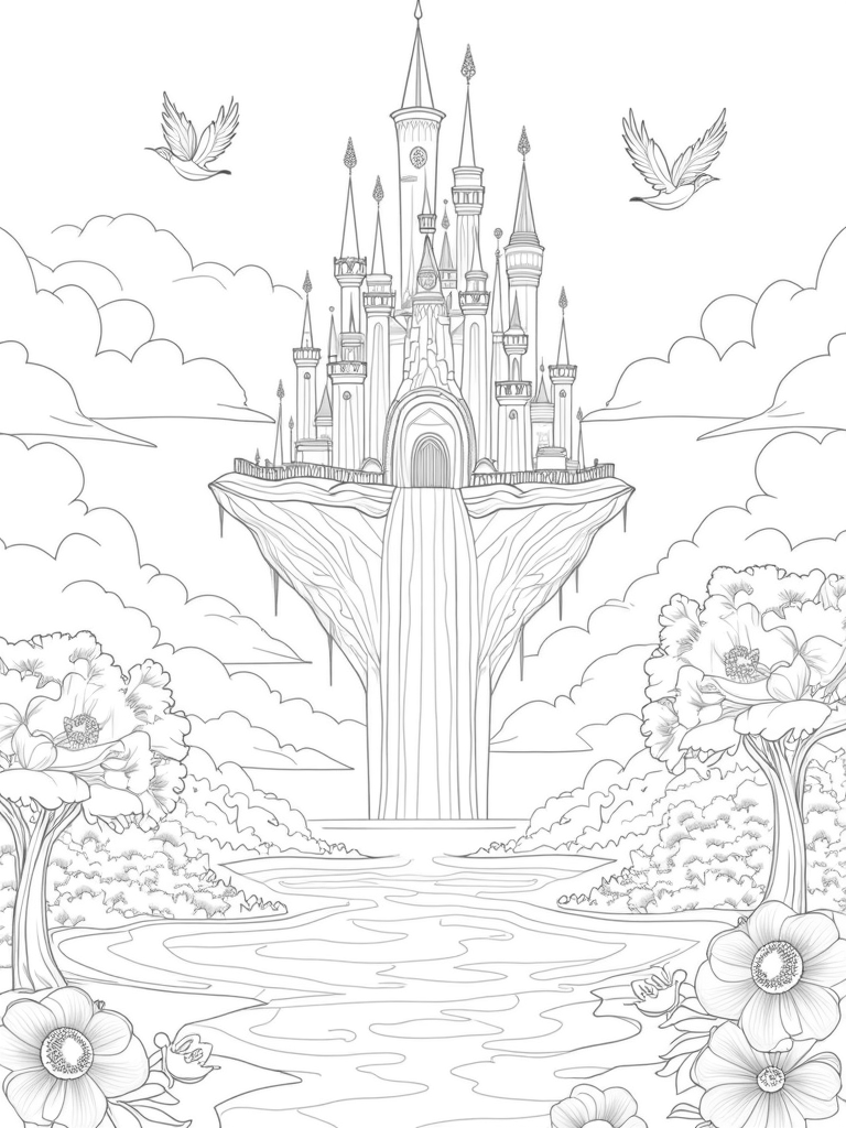 In the bright sky above, you'll spot some charming birds with feathered crowns soaring gracefully. They seem to be enjoying the soft sunlight as they fly around the castle. These friendly feathered friends add to the enchanting atmosphere of this floating wonder, making it a perfect place for kids to let their imaginations run wild while coloring.