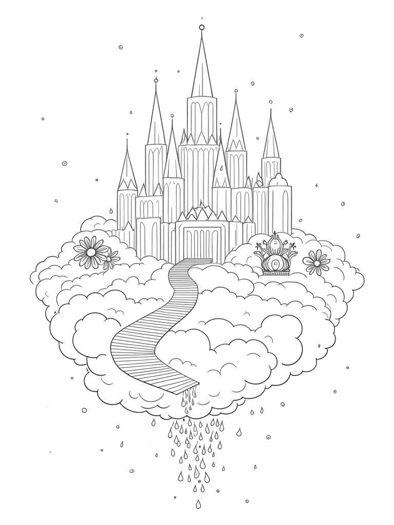 Scattered around the palace are oversized flowers, each with intricate petal patterns that curl into playful shapes. Look closely, and you'll spot a giant mirror leaning against one of the clouds, reflecting a shower of twinkling stars above. Plus, a delicate tiara made from branches and blossoms rests atop a fluffy cloud, adding an extra touch of magic to this dreamy landscape.