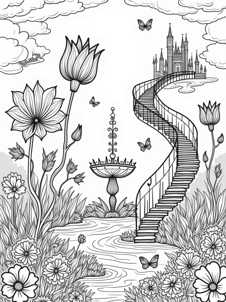This enchanting scene showcases a garden filled with towering flowers that look like crowns, each petal spiraling out in a magical way. Right in the center, there’s a shimmering fountain that flows with colorful ink, making it the perfect spot for delicate butterflies that resemble tiny tiaras to flutter around. Can you imagine how fun it would be to see these butterflies up close?