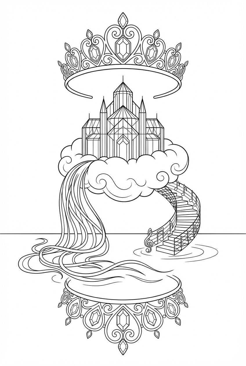 Each part of the scene is laid out with clean black outlines, so you can decide if the palace is icy blue or pastel pink, if the tiara shines with violet gems, or if the ribbons swirl in rainbow hues. The music‑note stairs are perfect for mixing gold, silver, or even a glittery neon. And don’t forget the cloud—soft, round, and ready for a fluffy white or a sunset orange.