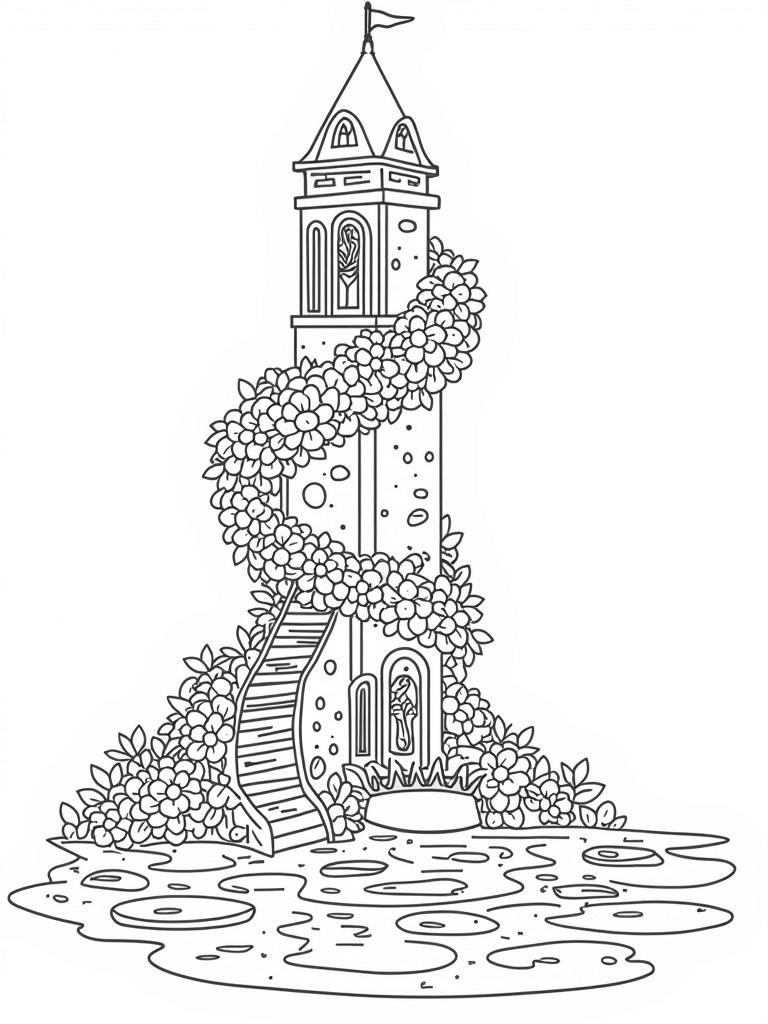 This free, printable coloring page features a grand castle tower, a shimmering pond, and a golden crown, perfect for kids who love all things princess! Dive into this enchanting scene and let your creativity shine!