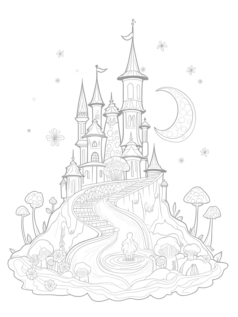 Look at this enchanting castle sitting right by a swirling, glittering lake! The tall turrets twist into the sky, and they’re covered in big, colorful flowers and vines that hang down like they’re having a party. A grand staircase spirals around a fountain that’s bursting with gems, and you can almost hear the water splashing into star-shaped pools. It’s like a scene from a fairy tale!