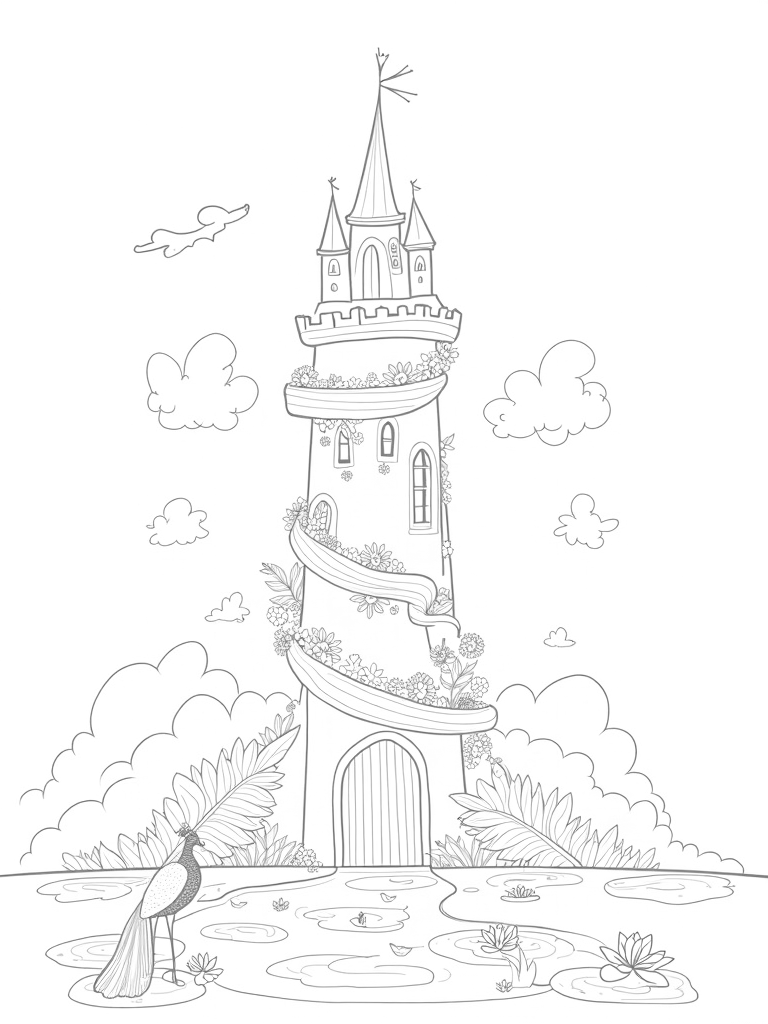 This free, printable coloring page features a magical castle tower, a vibrant peacock, and dreamy clouds. Perfect for kids who love princess themes, it's a fun way to spark creativity with coloring!