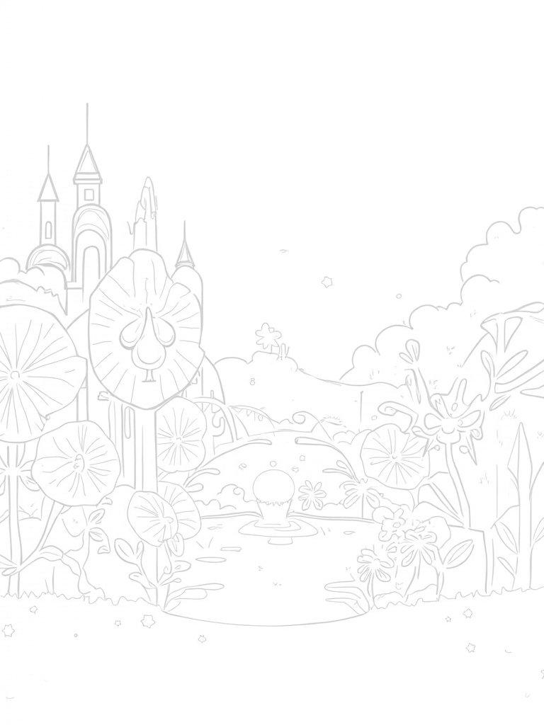 This delightful scene is all about a magical garden bursting with oversized flowers shaped like crowns. Each petal showcases vibrant patterns that are just waiting for your favorite colors. In the center, there's a shimmering fountain flowing with sparkling water, surrounded by twisted vines that create intricate designs. It’s a perfect spot for a fairy to take a refreshing drink!